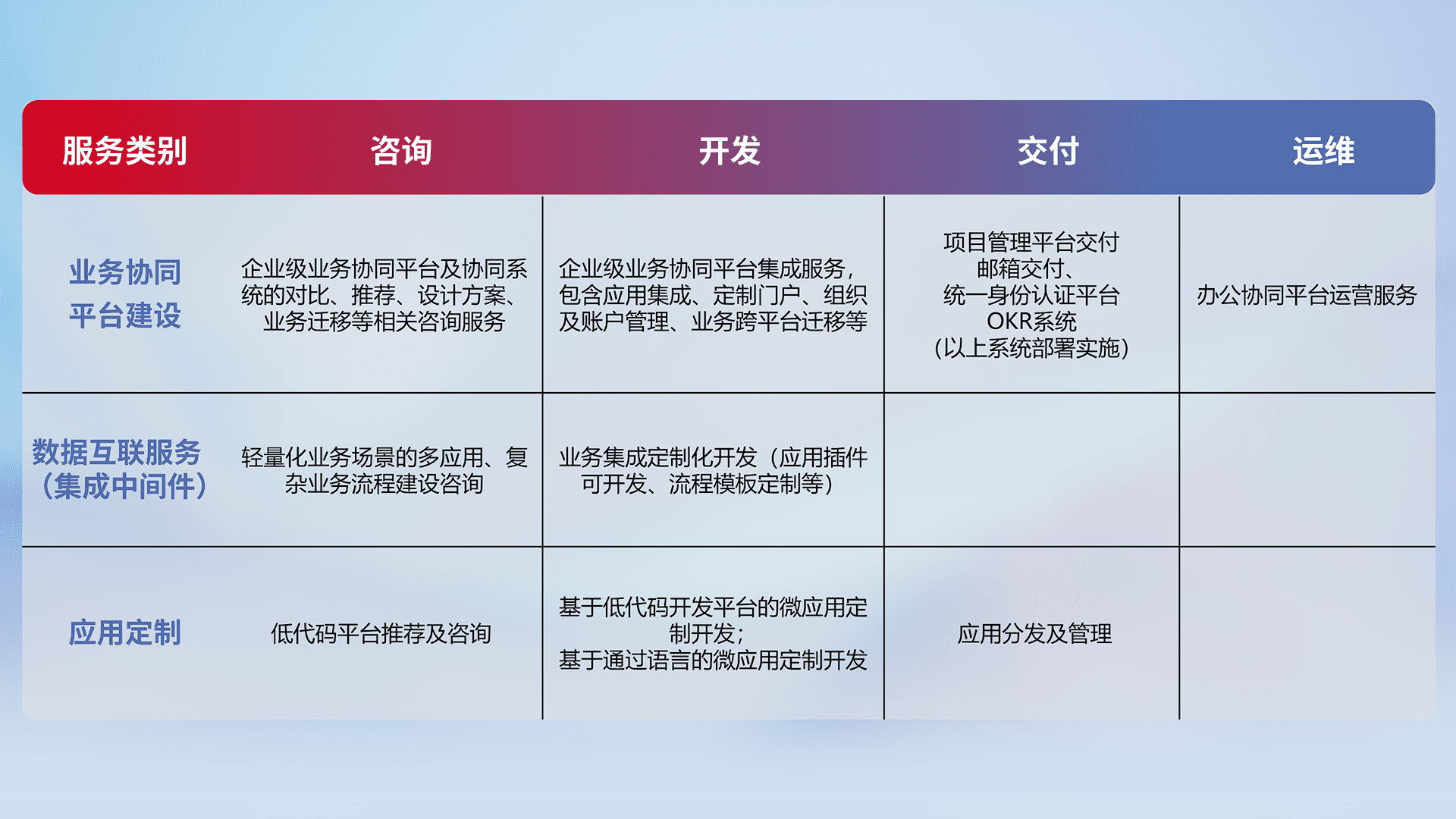 针对钉钉、、企微、、、、IDaas等平台级产品提供产品的规划、、、、方案、、、、交付、、、定制化开发等服务,,,,实现如统一协同办公、、智能客户服务、、混合会议管理、、、智能数据查询、、、、等业务场景,,实现数字化转型。。。